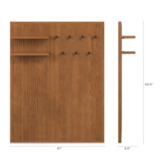 Meet Kouva. It's refined, well-balanced, and as aesthetically pleasing as the clothing you'll hang from it. With a generous amount of coat hooks and two sizeable shelves, you'll have enough storage for even the biggest family get-togethers. Topped off with a pleasing fluted solid wood design, Kouva gives your entryway the glow-up it deserves.