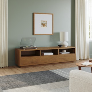 The strong, silent type. The Leif Media Unit embodies the classic tropes we associate with Scandinavian good looks: slender, blond, sturdy, impeccable posture. But it's not all good looks and clean lines; it's also soft-spoken and sensitive to your (storage) needs. Featuring three discreet soft-close drawers and three open cubbies topped with cable management cut-outs, it boasts some serious storage capacity. Set atop a subtle plinth base, the Leif Media Unit is the perfect way to keep an open, airy vibe without sacrificing storage space.