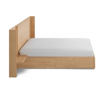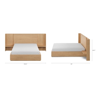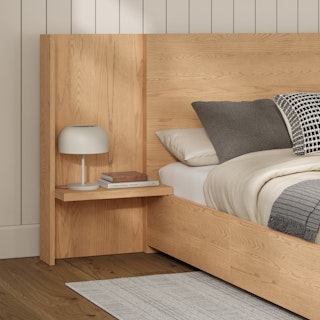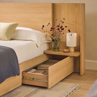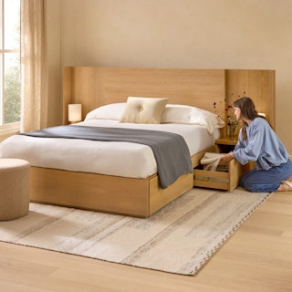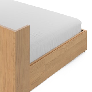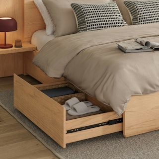 The strong, silent type. The Leif storage bed embodies the classic tropes we associate with Scandinavian good looks: tall, blond, sturdy, impeccable posture. But it's not all good looks and clean lines; it's also soft-spoken and sensitive to your (storage) needs. Featuring four soft-close drawers — two on either side, the Leif boasts some serious storage capacity. Now available with our Leif extensions included, they add a bedside table to either side while maintaining access to its ample storage. The extensions create a pleasing l-shaped wall for a cozy, cocooning effect — the perfect way to keep an open, airy vibe without sacrificing storage space.