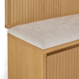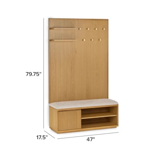 Meet Kouva. This wall panel and bench combo is refined, well-balanced, and as aesthetically pleasing as the clothing and shoes you'll store in it. With a generously padded and upholstered seat cushion, ample coat hooks and two sizeable shelves, you'll have enough storage for even the biggest family get-togethers. Topped off with a pleasing fluted solid wood design, Kouva gives your entryway the glow-up it deserves.
