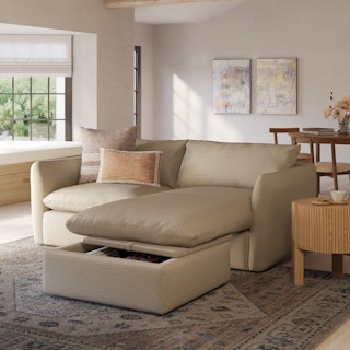 Cloud kingdom, population: you. The Leigh is our comfiest sofa ever, and now it's available as the comfiest hybrid of all: a reversible storage sectional. With a reversible chaise cushion and ottoman for left or right orientation, ample storage space within the ottoman, and stuffed with super-soft foam and duck down, the Leigh is your perfectly-sinkable sofa solution that still looks polished and poised.