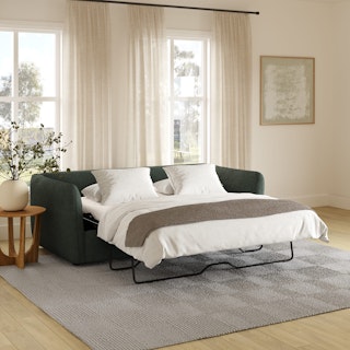 Cloud kingdom, population: you. The Leigh is our comfiest sofa ever, and now it's available as the comfiest hybrid of all: a sofa bed. Stuffed with super-soft foam and duck down, the Leigh is your perfectly-sinkable sofa solution that still looks polished and poised. Upholstered in a soft, non-absorptive bouclé fabric, you can rest easy.