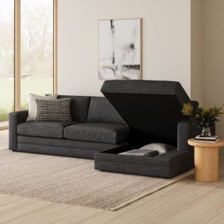 - Spacious storage hidden beneath chaise cushion. Accessible by an easy-to-use hydraulic-assisted lift function