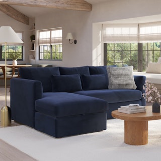 How do you want your sofa to feel? Elevated, comfortable, calm, and collected. With clean details and pleasing design heft, the Marina reversible storage sectional manages to feel at once laid-back and put together. Generously padded seats and armrests encourage long periods of meandering, while the hidden storage below the chaise can hide all kinds of goodies. Upholstered with Hale velvet, the Marina is fade-resistant, easy to clean, and anti-crush. Throw on your favorite 90s romcom and bask in a little nostalgia.