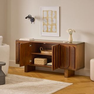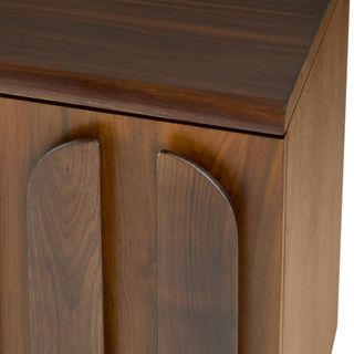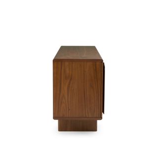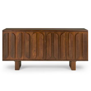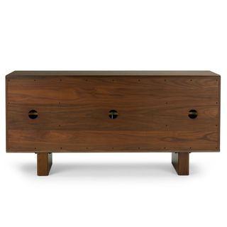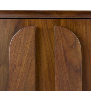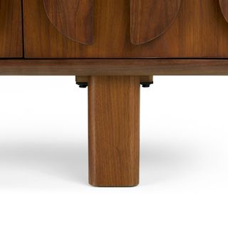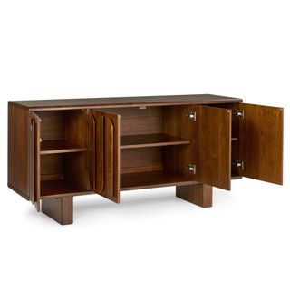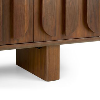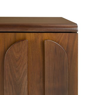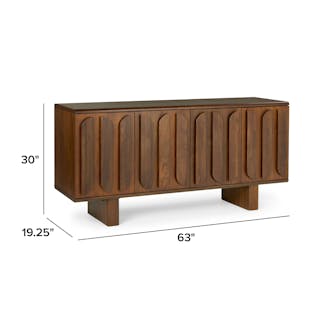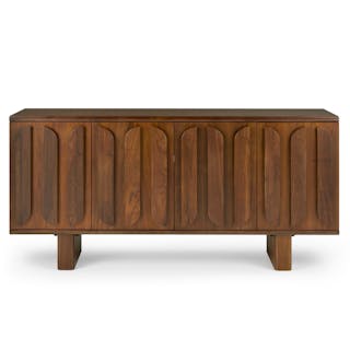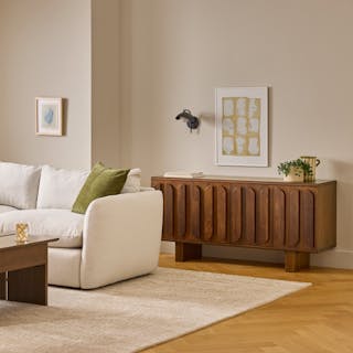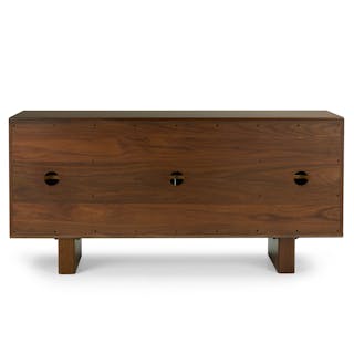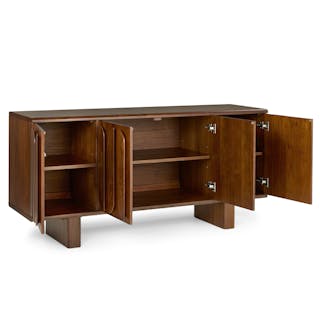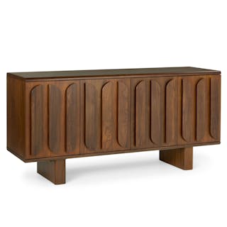 Ansel knows how to work its angles. Adorned with a contemporary take on vintage motifs, its repeating solid wood facing doubles as handles. Ansel sports three cable management cutouts and adjustable shelving on the outer storage compartments, all supported by sturdy sled legs. Ansel offers ample storage space, making organization effortless and stylish.