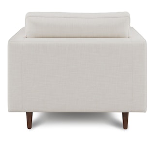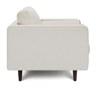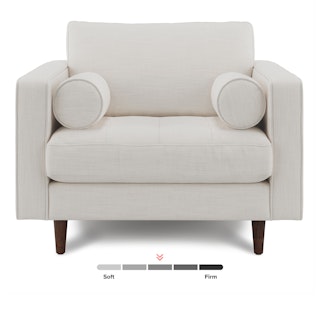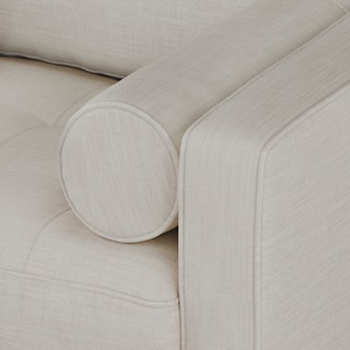 Our most popular sofa, reimagined as a large, cozy lounge chair. This modern take on a mid-century classic features clean lines, a tufted seat, and a luxuriously stuffed back cushion. Two matching round bolsters complete the look.
