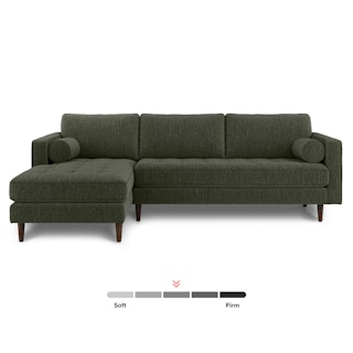 Oh, you like green space? This green sectional sofa is ready to snuggle. The Sven fir green sectional is made from a corner-blocked wooden frame and dapper medium-weave tweed fabric. Loose back cushions and bolsters make the Sven easy to clean, and great for arranging the perfect movie-watching position.