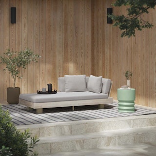 Stay a while. The Lubek chaise is built from a solid acacia wood base. The sofa is set close to the ground, encouraging you to really sink into (or even lie down on) those weather-resistant cushions. Crisp cushions and super clean lines add to the Lubek’s modern look, while the warmth of the acacia wood makes the sofa easy to pair with any backyard set up. We call this look “low key modernism."