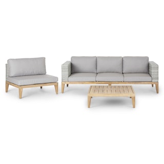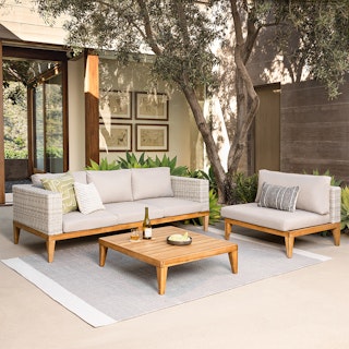 The gang’s all here. Get down with Urba Sofa Set, featuring its solid-acacia coffee table, synthetic wicker lounge chair, and cozy as-all-get-out sofa. Could the backyard get any better?