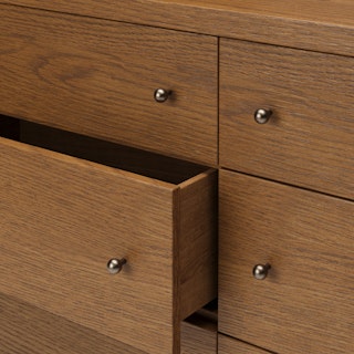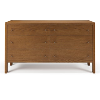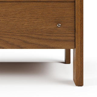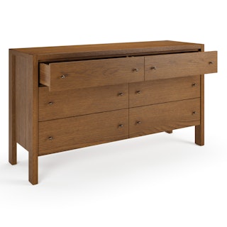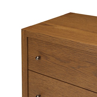 Studied simplicity. The Cassie dresser is composed of simple lines and beautiful materials. With solid wood legs, exposed end grain, and timeless bronze-colored drawer pulls, the Cassie pairs well with your vintage candlestick collection, or with your new handmade vase you brought home from the craft market.