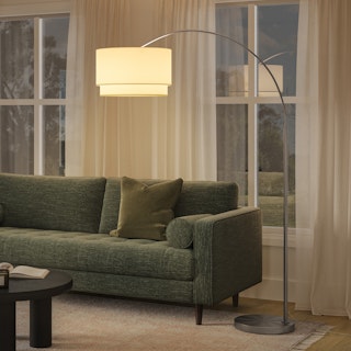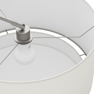 A light that's ahead of the curve. The Zebu tall floor lamp features a taut double-shade in a lovely textured linen. Suspended from a brushed nickel frame, this is a light that's as elegant as its owner (is that... you?).