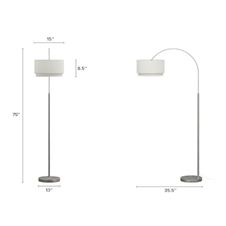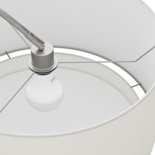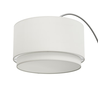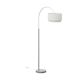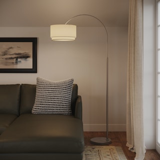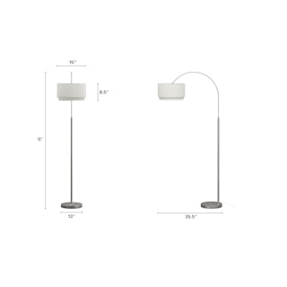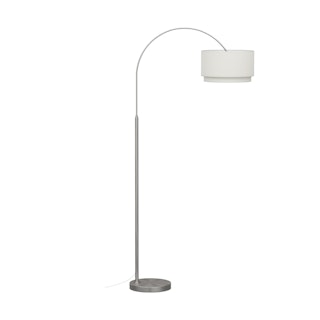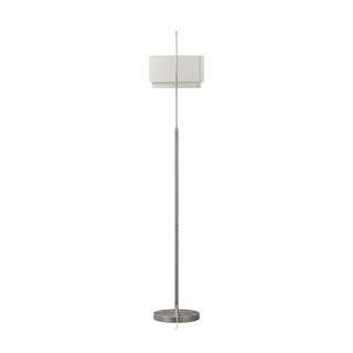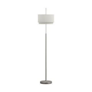 A light that's ahead of the curve. The Zebu short floor lamp features a taut double-shade in a lovely textured linen. Suspended from a brushed nickel frame, this is a light that's as elegant as its owner (is that... you?).