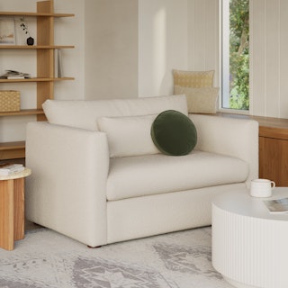 How do you want to feel? Elevated. Comfortable. Calm. Collected. With clean details and pleasing design heft, the Marina sleeper lounge chair manages to feel at once laid back and put together. Generously padded seats and armrests encourage long periods of meandering; fold out that memory foam mattress for a more serious nap. Upholstered with our super soft Bouclé fabric, the Marina is low-absorption with a signature bouncy texture. Throw on your favorite 90s romcom and bask in a little nostalgia.
