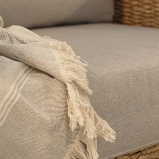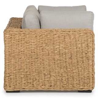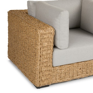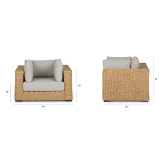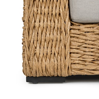 Inviting by nature, the twisted weave of this faux banana leaf wicker lounge chair evokes a coastal calm worthy of all day (or all night) lounging. The Capra chair features a sturdy aluminum base and is generously topped with multiple weather-resistant pillows and a cushion fit for private island-style relaxation.