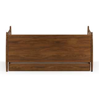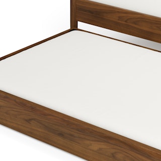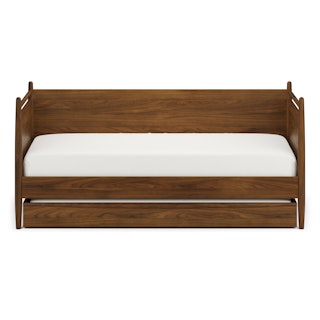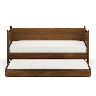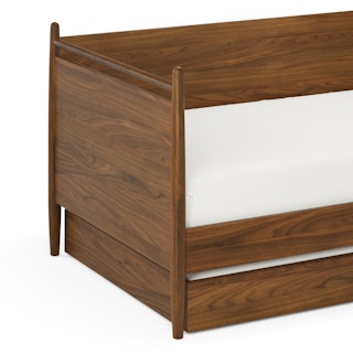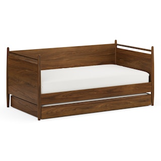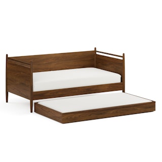 Simple pleasures. The Lenia bed draws inspiration from the Shaker school of design, featuring tapered legs, solid beech and veneered walnut, a panel headboard, concealed joinery, and an unadorned silhouette. Now available for the kids' and/or guest room, our trundle set offers versatile functionality and an elegant design, ideal for maximizing space and comfort. Sweet dreams.