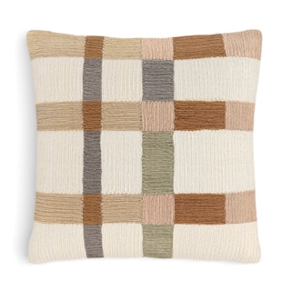 A pattern that favors the bold, the Wren pillow leans in to gallant checks and dashes. The applique weaving style gives the design a raised finish, which when combined with the earthy color story, brings an organic ease.