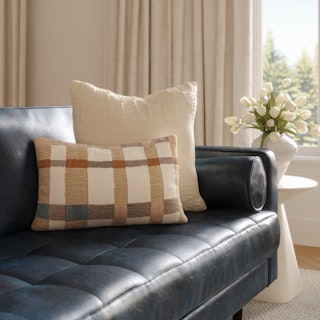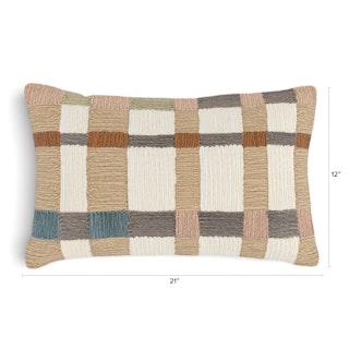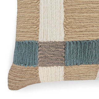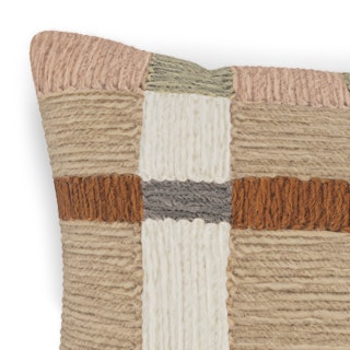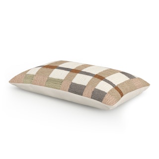 A pattern that favors the bold, the Wren pillow leans in to gallant checks and dashes. The applique weaving style gives the design a raised finish, which when combined with the earthy color story, brings an organic ease.