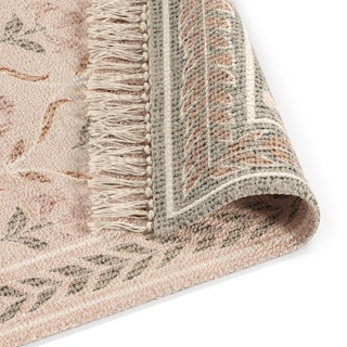 Transform the atmosphere of your home with a simple flip. Cecile features a reversible design with a rich, textured floral motif on each side: one side in Olive Green and the other in Earthy Beige — what'll it be today?
