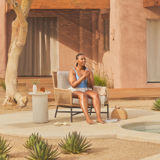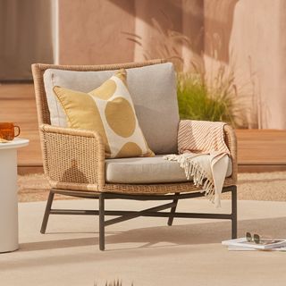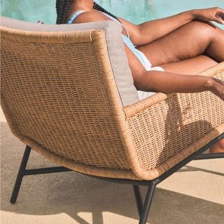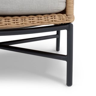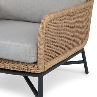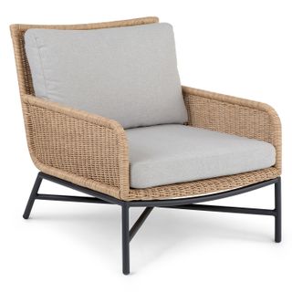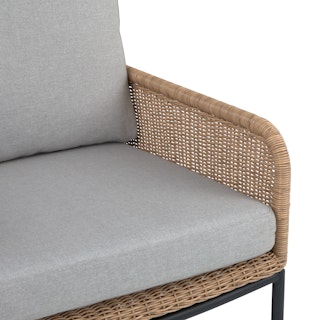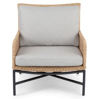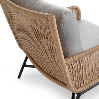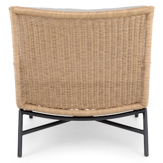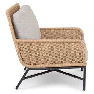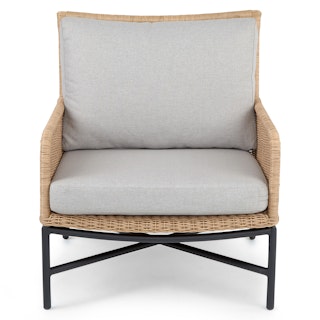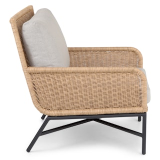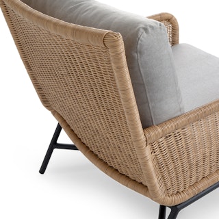 Subtle, swanky, and sleek by design. The Tody Lounge Chair doesn’t have to show off to get noticed. The slight curve of enveloping arm rests and tightly woven faux rope trim elevates the design of this classic faux wicker chair. A crisscrossed powder-coated steel frame and loose cushions upholstered in UV and stain resistant fabric add the kind of durability and contemporary finesse ideal for both outdoor and indoor dining.