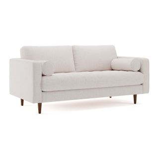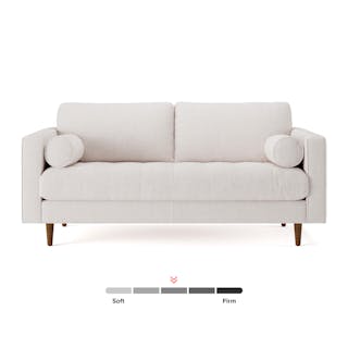 Our most popular sofa, reimagined for apartment living. This modern take on a mid-century classic features clean lines, a tufted benchseat, and luxuriously stuffed back cushions. Two matching round bolsters complete the look.
