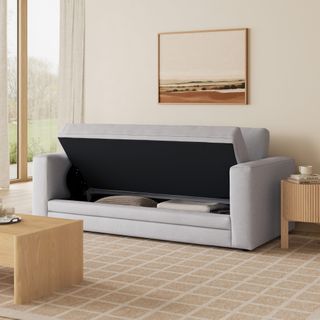 - Spacious storage hidden beneath seat cushion. Accessible by an easy-to-use hydraulic-assisted lift function