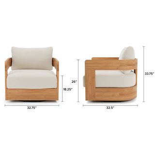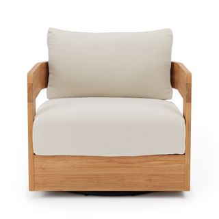 Take in a 360-degree view of your outdoor space with Pilou. With a round, wooden frame and wide arms, Pilou sits on a swivel base, ensuring no conversation is missed. Spilt drink? Don't worry—Pilou's plush, foam-filled cushions are wrapped in our UV- and water-resistant Olefin fabric. So, whether you're lounging in the sun or enjoying a conversation with friends, Pilou's neutral tones seamlessly fit into both contemporary and minimalist settings, infusing your backyard with a calm, serene aura.