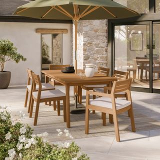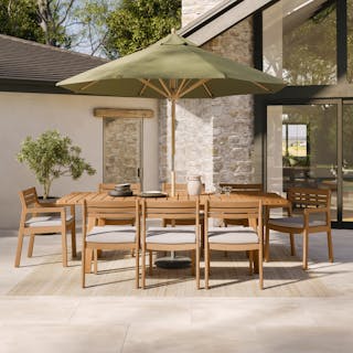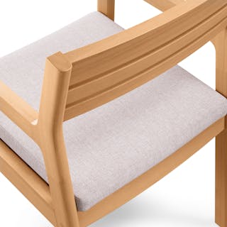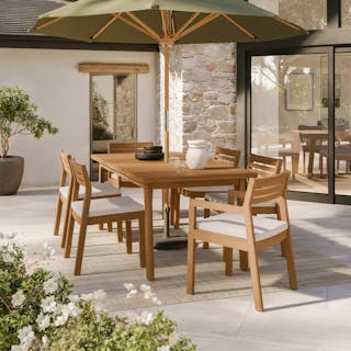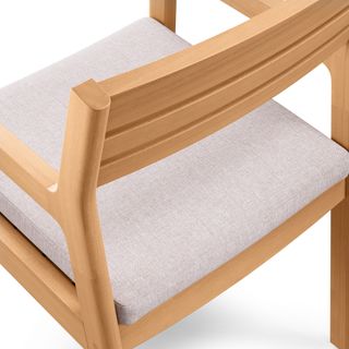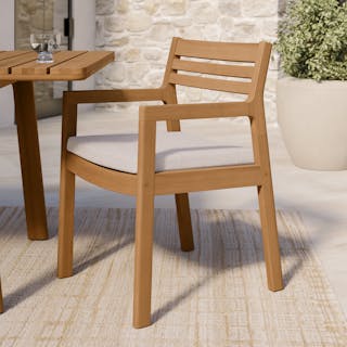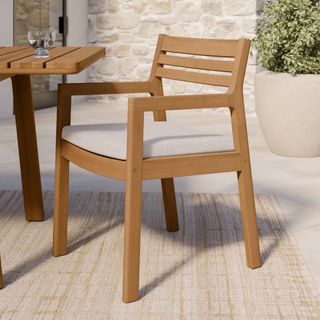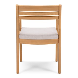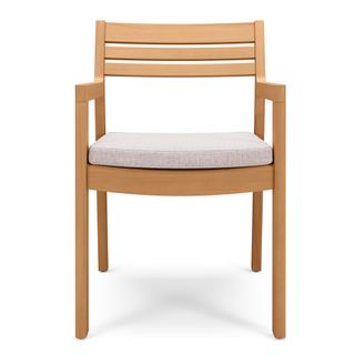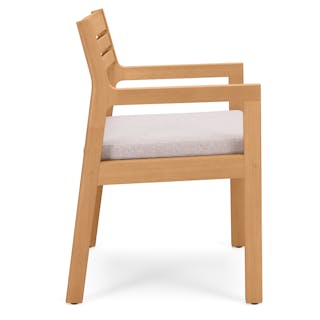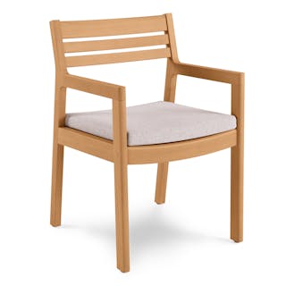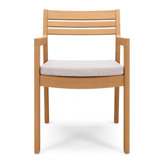 The Elise dining armchair embodies the ease we hope for every summer vacation. With a curved, slatted back and a seat pad, the Elise chair also stacks, freeing up your outdoor space for lawn games, tag, or simply laying down in the grass.