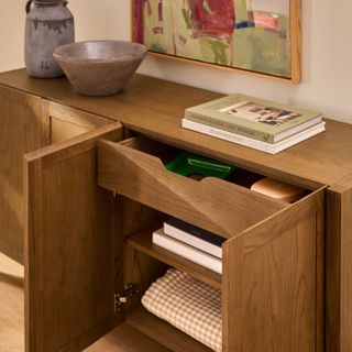 - Made from a mix of veneered and solid wood: veneer is highly durable, whereas solid wood is used to build beautiful details and support weight