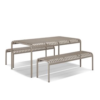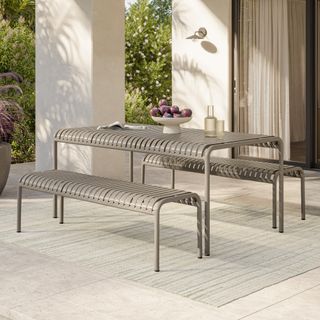 - Set includes two benches and dining table