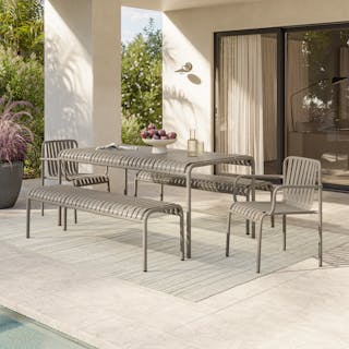Stripes look good on everyone — but especially on this glossy, powder coated dining table set. The Sarek is built from solid steel, kind of like Superman. Also like Superman? It’s sexy, dependable, and capable of saving your patio from the scourge of… ugly furniture.