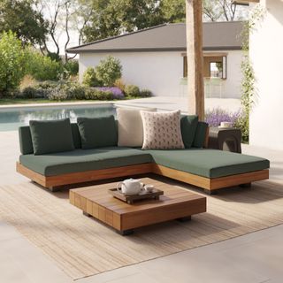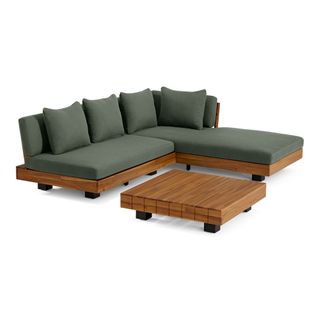 Get low. It will be love at first sight when you lay eyes (and then your whole body) on the Lubek Sectional Set. The L-shaped sectional features a solid acacia wood base and is complimented by structured yet comfortable weather-resistant cushions. Where will you put your snacks, you ask? The Lubek Coffee Table is just the spot. With matching solid acacia wood construction, it’s the perfect companion. This set was meant to be.