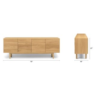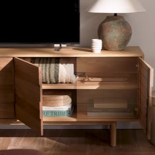 The Merto is classy, very classy. Its undulating solid wood door design add depth and interest to an otherwise understated piece. With ample storage, adjustable shelving, and cable management, it’ll handle anything you stuff into it.