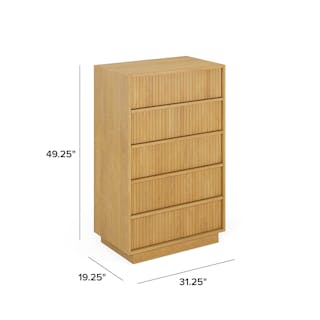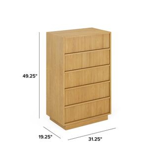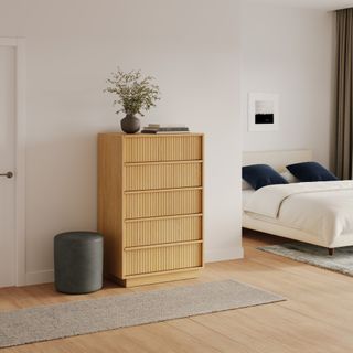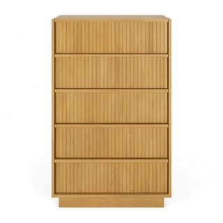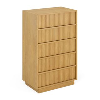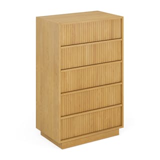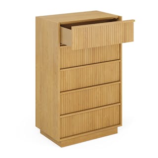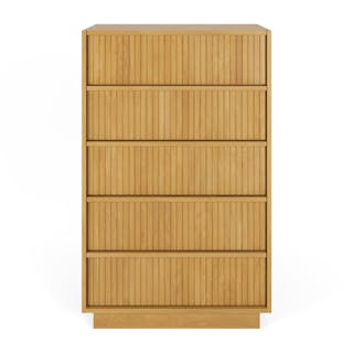 With a lovely tambour facade and five soft-close drawers, the Kouva chest is as pretty as the clothes you'll store in it. Solid wood handles and a heavy wooden plinth base offer sturdiness and visual interest without being overly showy. Interesting... refined... well-balanced... sounds like a perfect bedroom companion.