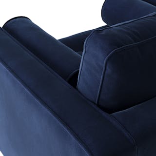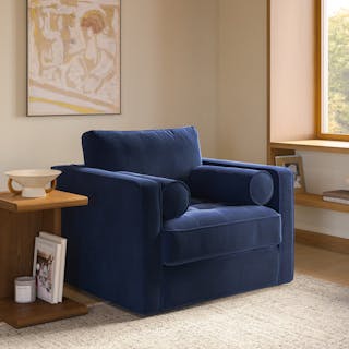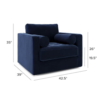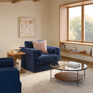 The mid-century classic, reimagined. This fresh take on our most popular collection features the exact dimensions as its tapered-leg sibling, but now with a discreet 360° steel swivel base—perfect for practicing your best Bond villain turn. Built on a corner-blocked solid-wood frame with loose bolsters and back cushions, this iteration stuns just like its lofty siblings. Tuck it into a nook or make it the main event of your space. It’s destined to be a star.