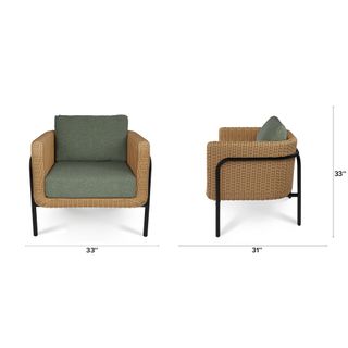 - Loose seat and back cushions upholstered in a UV and water-resistant Olefin fabric.