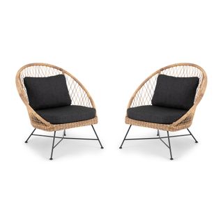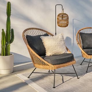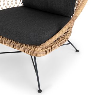 Tropical and stately, the Aeri lounge chair looks great sitting on your deck or as the star of your backyard. Woven from matte resin wicker, set on a black metal frame, and topped with a comfy cushion, the Aeri is here to make your space feel bohemian and loungey.